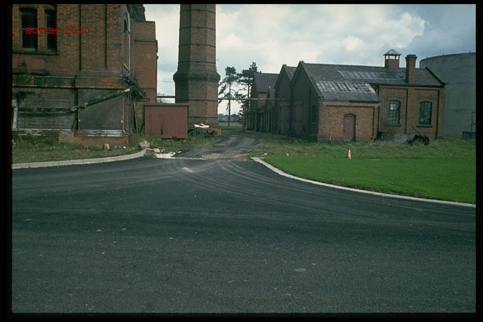 View from access road showing AB engine house, chimney, workshop, agitator house, forge, tea cabin, sludge tank