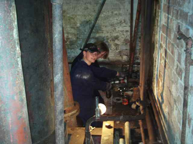 • The steam main has now been connected to 'E' Engine House. The picture shows the connection being made in the bowels of CD Engine House. The major parts of the storm water pump have also been roughly positioned to allow pipework routing to be worked out. The left hand end of the picture shows the condensor, which we believe was not actually used during the working life of the engine.