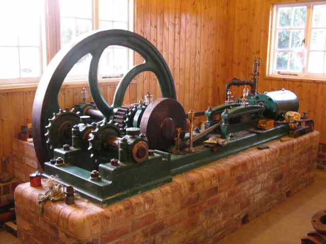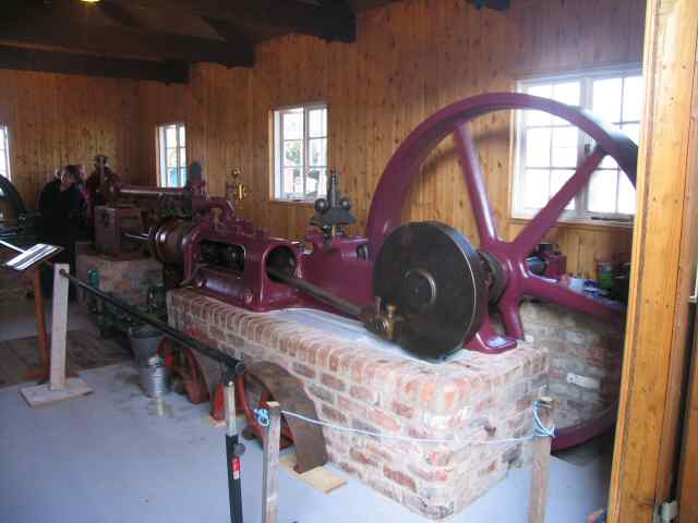 • In 'E' engine house, the main engines are just about ready for our official opening in October. The portable has had a box built under it to simulate how it was embedded in the concrete floor in the original lime shed. The storm water pump and agitator engine are also complete.