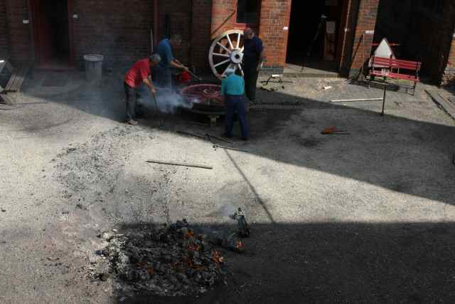 • The iron tyres have been fitted to the pipe drug wheels. The tyres were heated in a fire and then lowered over the wheel which was fastened to the large wheelwright's platform. The wheel is then cooled down to shrink the tyre onto the wheel.