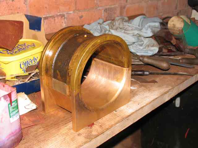 • Work is continuing on B engine. One of the replacement bearing shells is shown here being fitted to its other half.